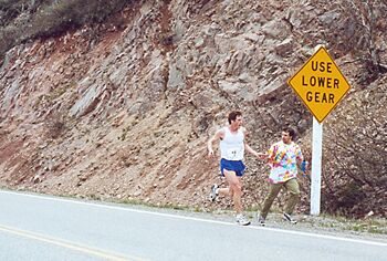 In the all-female team race, "A League of their Own" already had a gap on the Ice Girls as their total time after this leg was 3:52:49.Leg4 - 20km (smokey mntn. 5 rating): Taking to heart the advice of Kevin and Jason (who had previously this monstrousity before), Peter VanWesenbeeck probably ran one of the smartest races of relay. When we caught up with him about 5km in, Peter was situated in 3rd place. There was a substantial gap between the leader, the second runner and then a smaller gap to Peter. The encouraging part for me was that the Athletics East was still behind Peter. So, after supporting our other teams, we headed up to see what was transpiring at the front. Smokey, for those unaware, rises about 700ft in about 2.1km -- its STEEP! The leaders were already going up when we got there. Going up, we finally caught up with Peter. He had closed the gap on the second place and was right behind him. As we passed him (about 800m up the hill), he gave us a big smile and pump of the arm...I knew the guy ahead of him was toast. So, we drove up to the top to wait for him. Soon, the lead vehicle drove by..Peter was the first to crest and he had a lead! Although looking tired (it was about 9km into the 20km), he looked better than the runners that followed. The AE runner was a ways back. Peter managed to maintain (and maybe increase?) his lead. He finished first, with a 1:38 lead of the next runner. The AE runner finished in 6th and 7mins behind.